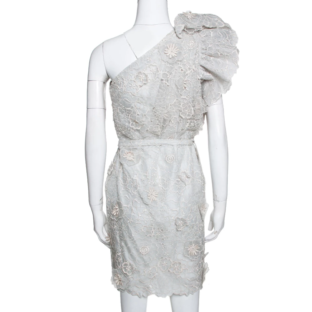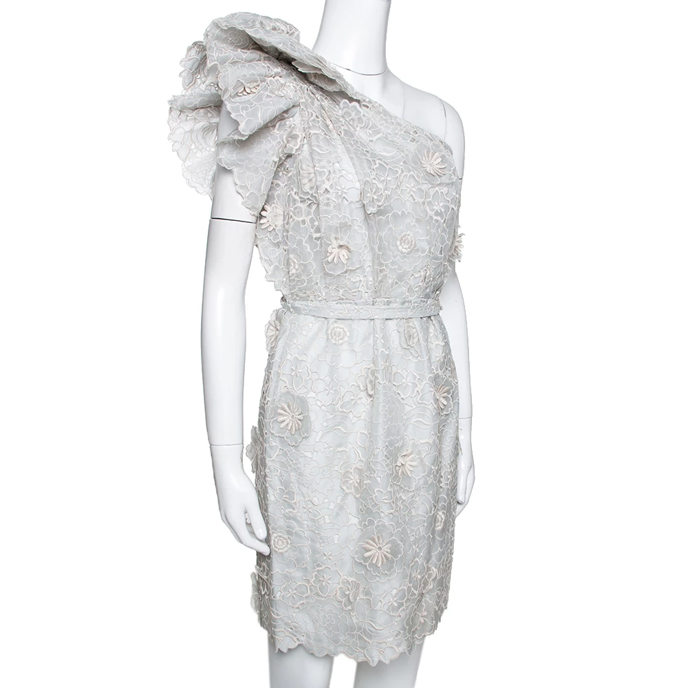 This pale grey dress is from Stella McCartney. This dress wins with its feminine design of the one-shoulder cut, the frill detail extending out and the fitted silhouette. The zipper on the side helps you easily slip into the dress.