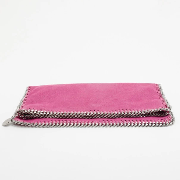 Dress up your outfit with this fashion forward Pink Falabella Clutch by Stella McCartney. This flap over style clutch is made from pink faux suede with polished silver chain link trim that features two Stella McCartney engraved round charms and a back zip pocket. The interior is lined with beige Stella McCartney printed canvas and features a zip pocket.