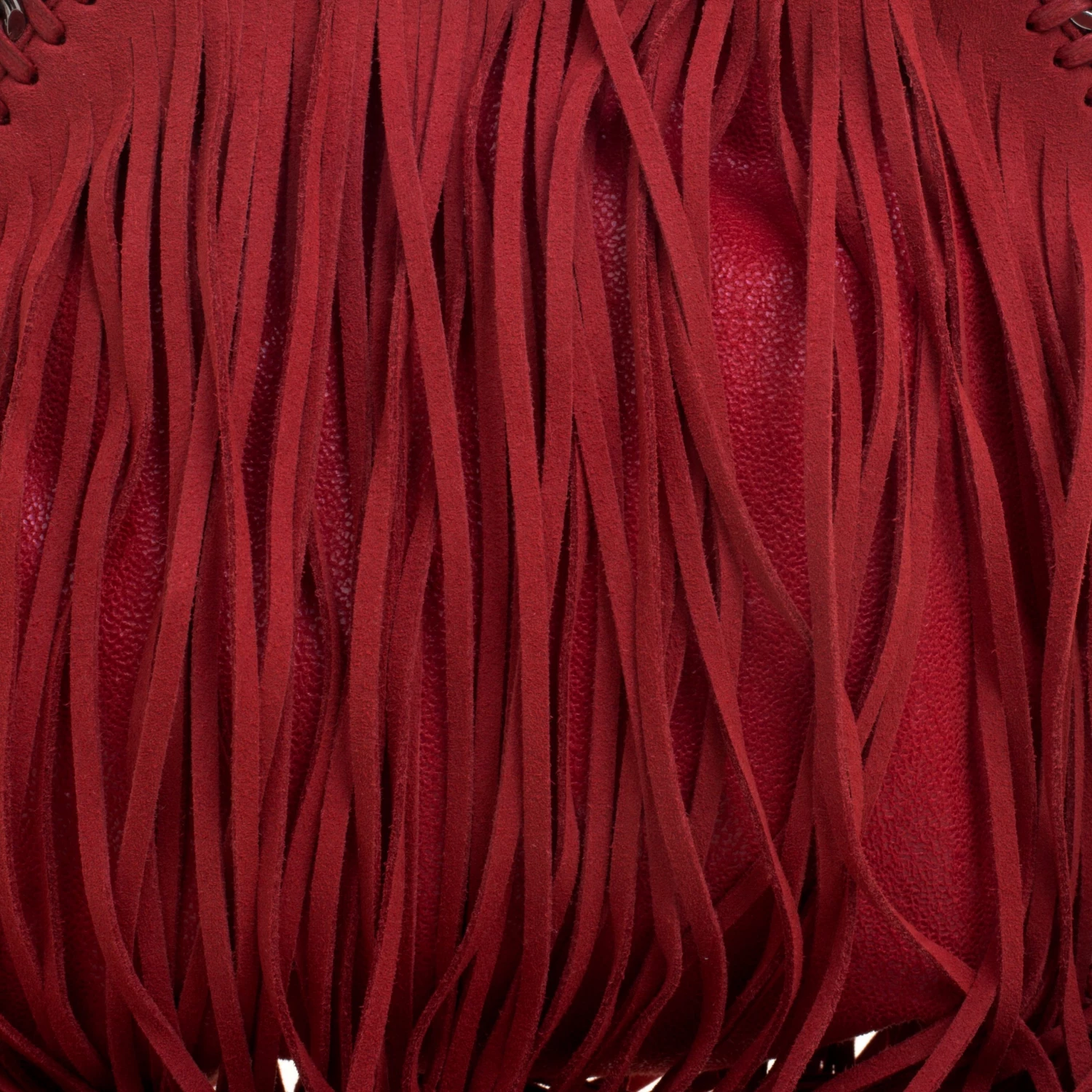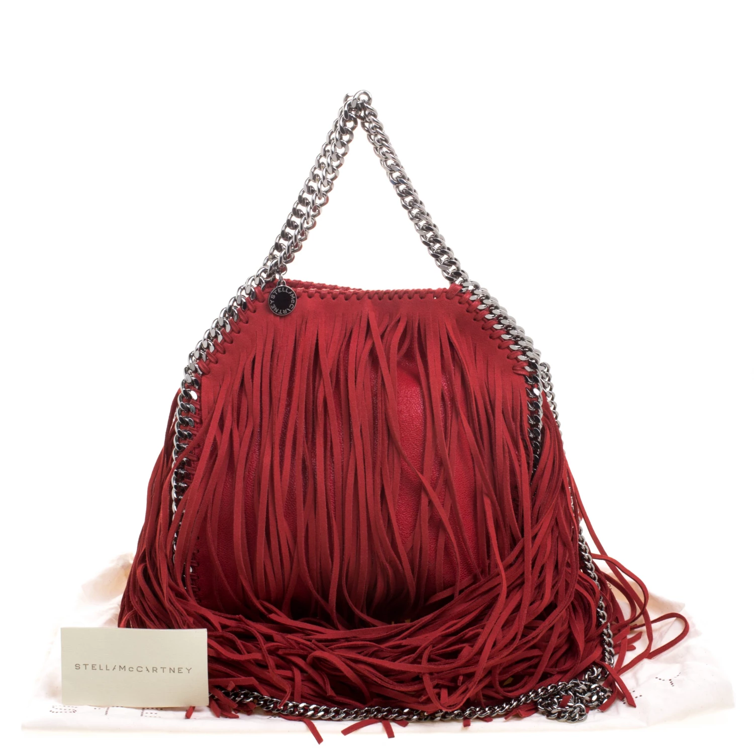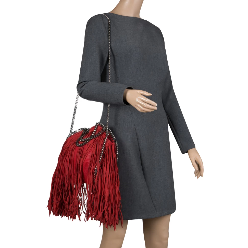 Stella McCartney is known for her chic designs and this mini Falabella fringe tote perfectly embodies this trait. Crafted in Italy from red faux leather with a fabric interior, this bag has a beautiful allover fringe exterior and silver tone chain details at its contours and as handles. This bag can be carried with your everyday outfits.