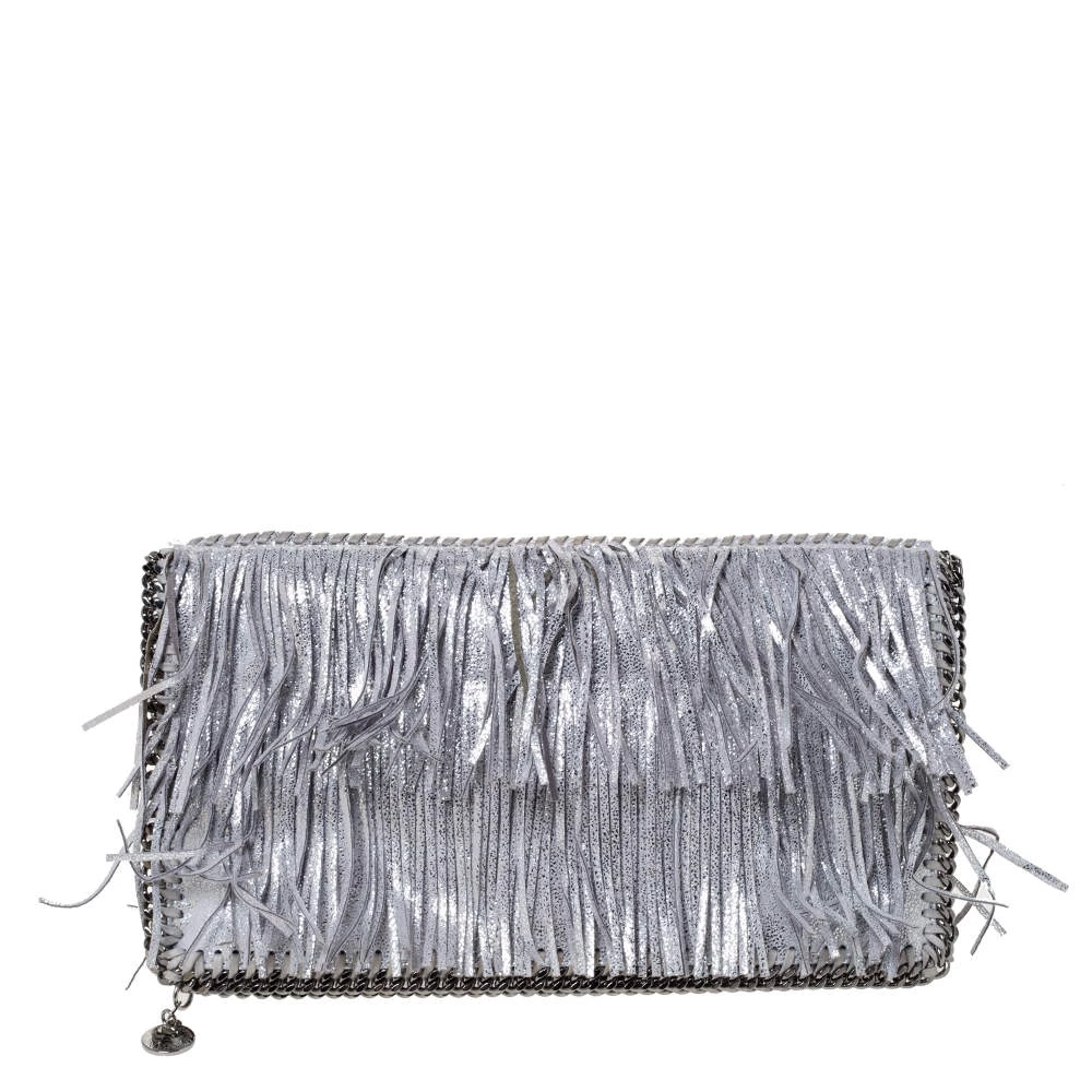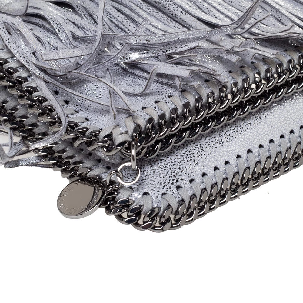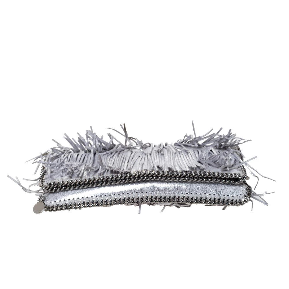 Stella McCartney is known for her modern yet elegant designs and this Falabella fold-over clutch perfectly embodies this trait. Crafted in Italy from faux leather with a nylon interior, this clutch has a beautiful fringed silver exterior and silver-tone chain details at its contours. It also comes with the signature logo-engraved charm as the zipper pull. This piece can be carried with all your chic outfits.