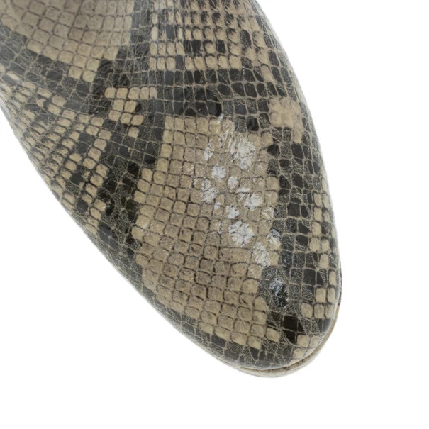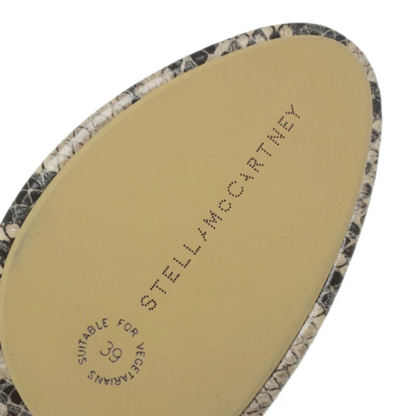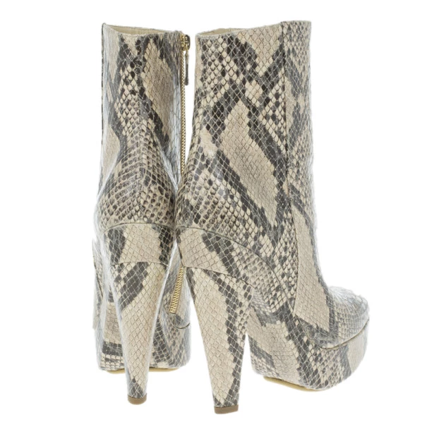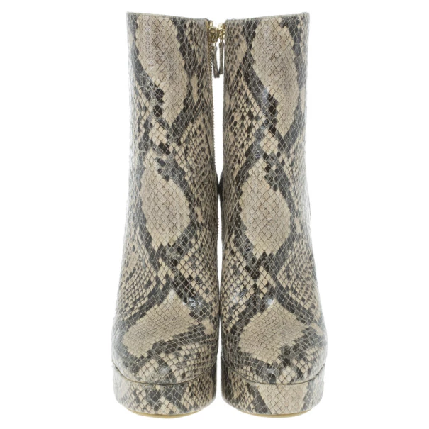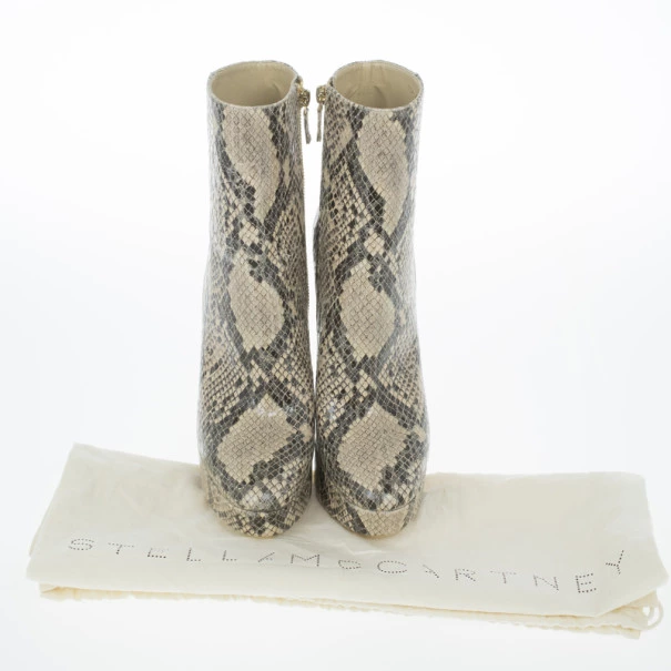 Part of the 2013 Fall/Winter collection, this pair of Stella McCartney ankle boots has it all. Its faux snakeskin leather exterior gives this pair an exotic look with different shades of brown, coupled with self-covered platforms and 11cm heels. Lined with beige faux leather, this pair have side zipper closures for easy wear.Original Retail Price: US $1,130