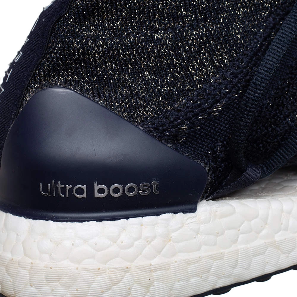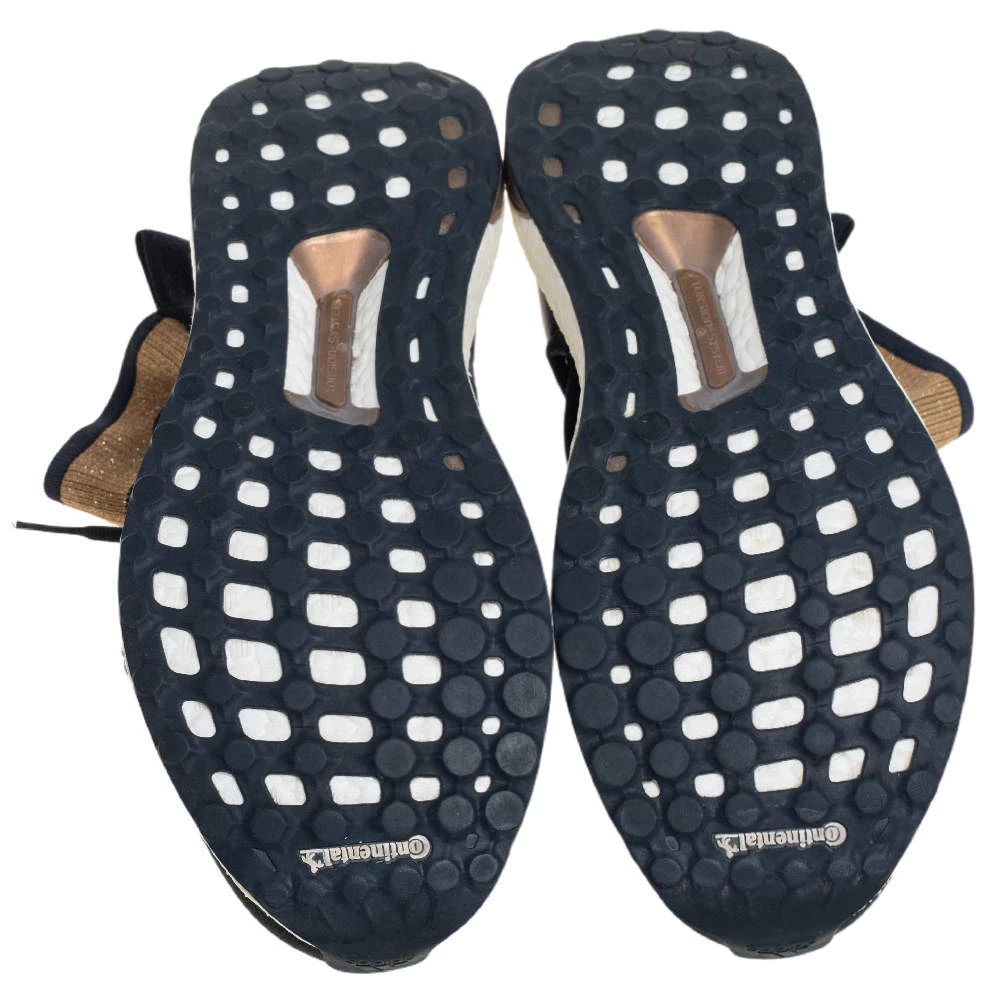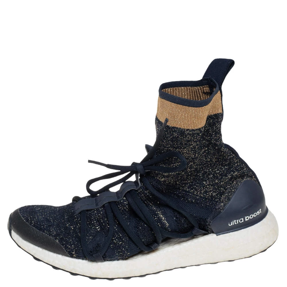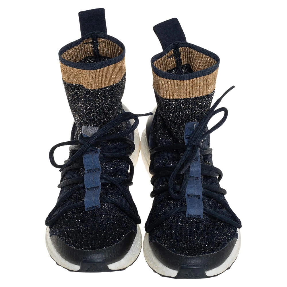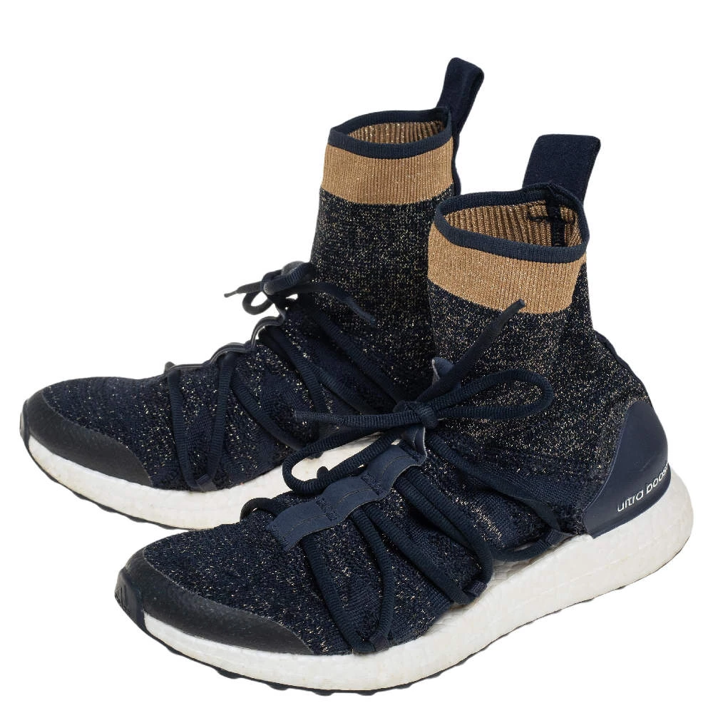 These high-top kicks are designed by Stella McCartney for adidas. Crafted from lurex knit in a blue shade, the materials employed to create these sneakers are ethically sourced. They feature a sock-like silhouette, laces on the vamps, and sturdy soles.