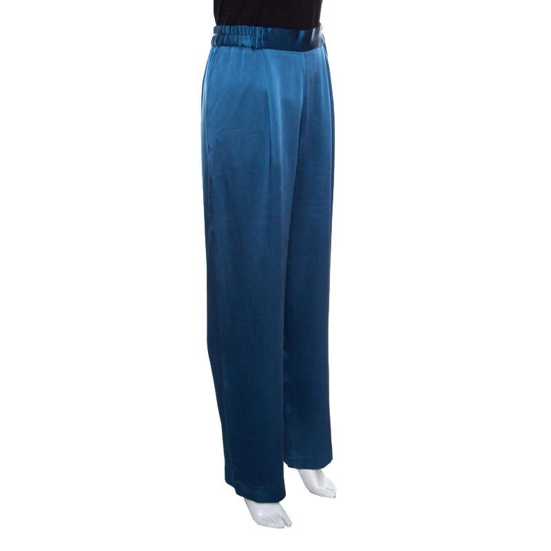 Stella McCartney’s pretty teal trousers are designed with wide legs. They are crafted with a blend of fabrics. The easing silhouette of these trousers makes them a comfortable piece of clothing which, when paired with a fitted blouse, gives you a chic evening look.