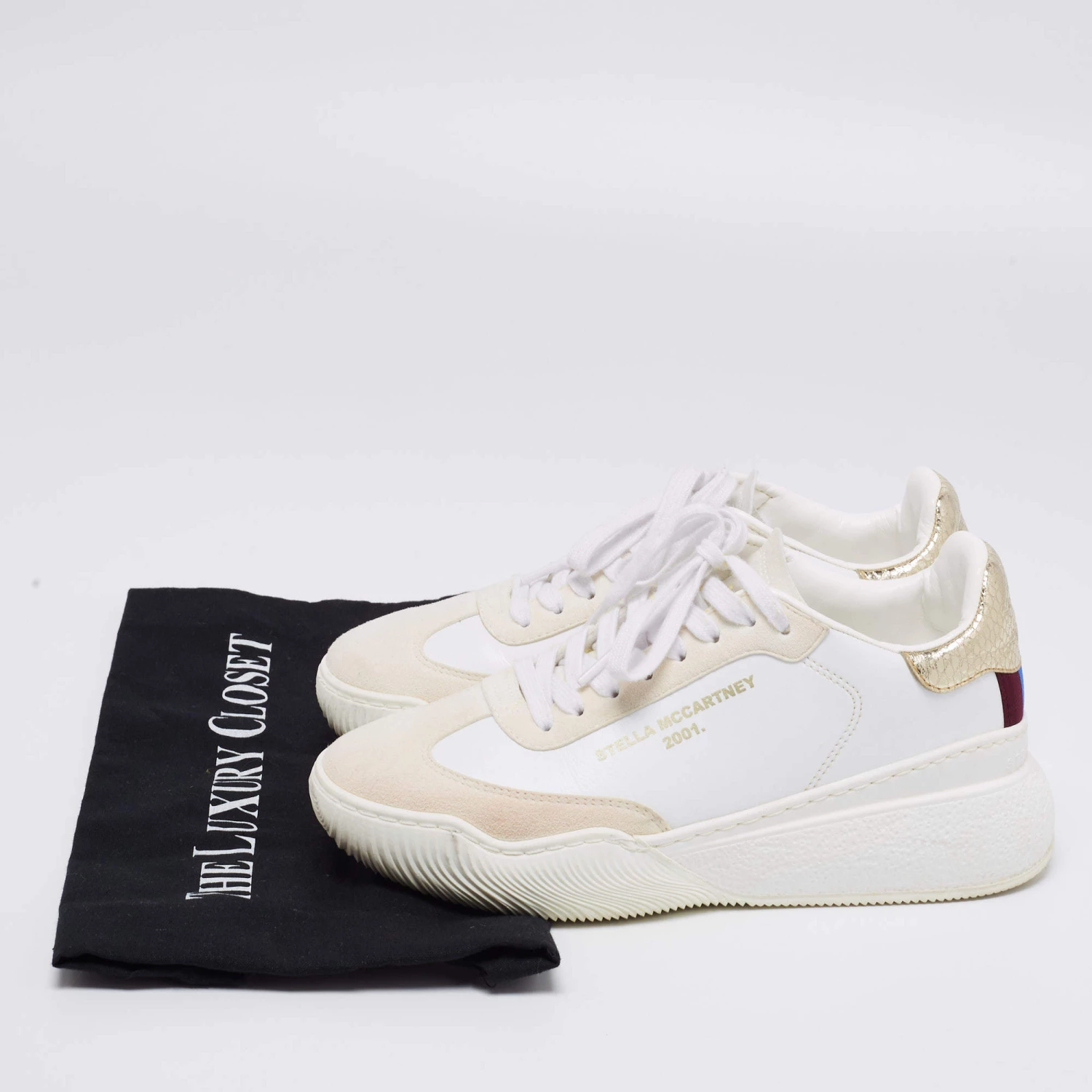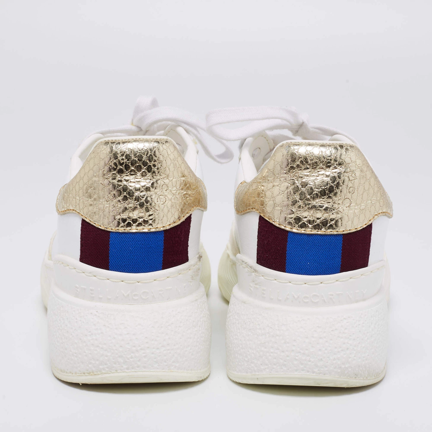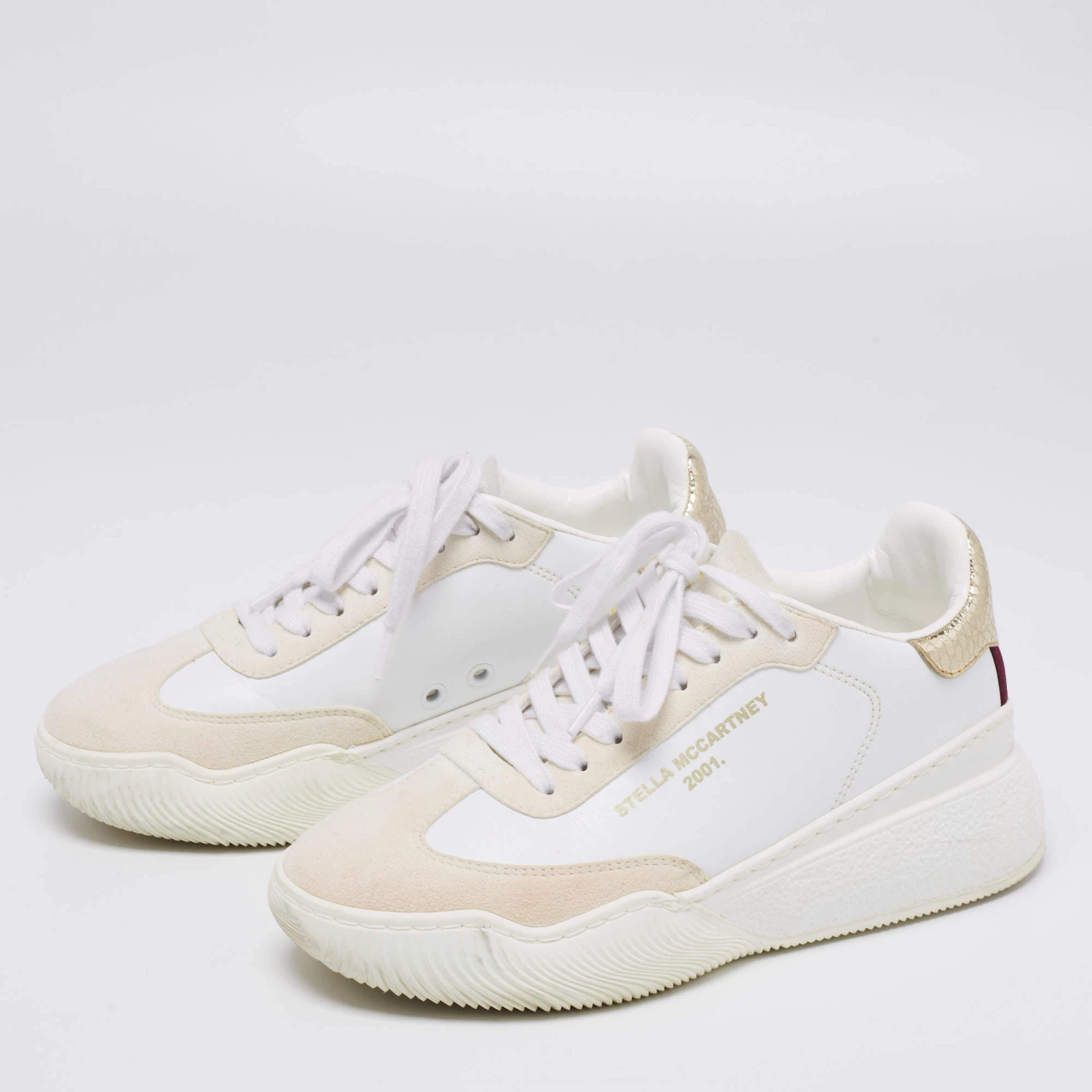 These Stella McCartney sneakers are an apt choice for a statement look. Created from faux leather and faux suede, they are paired with lace-up vamps, a brand signature on the sides, and rubber soles. The python-embossed detailing on the counter makes these shoes a valuable accessory.