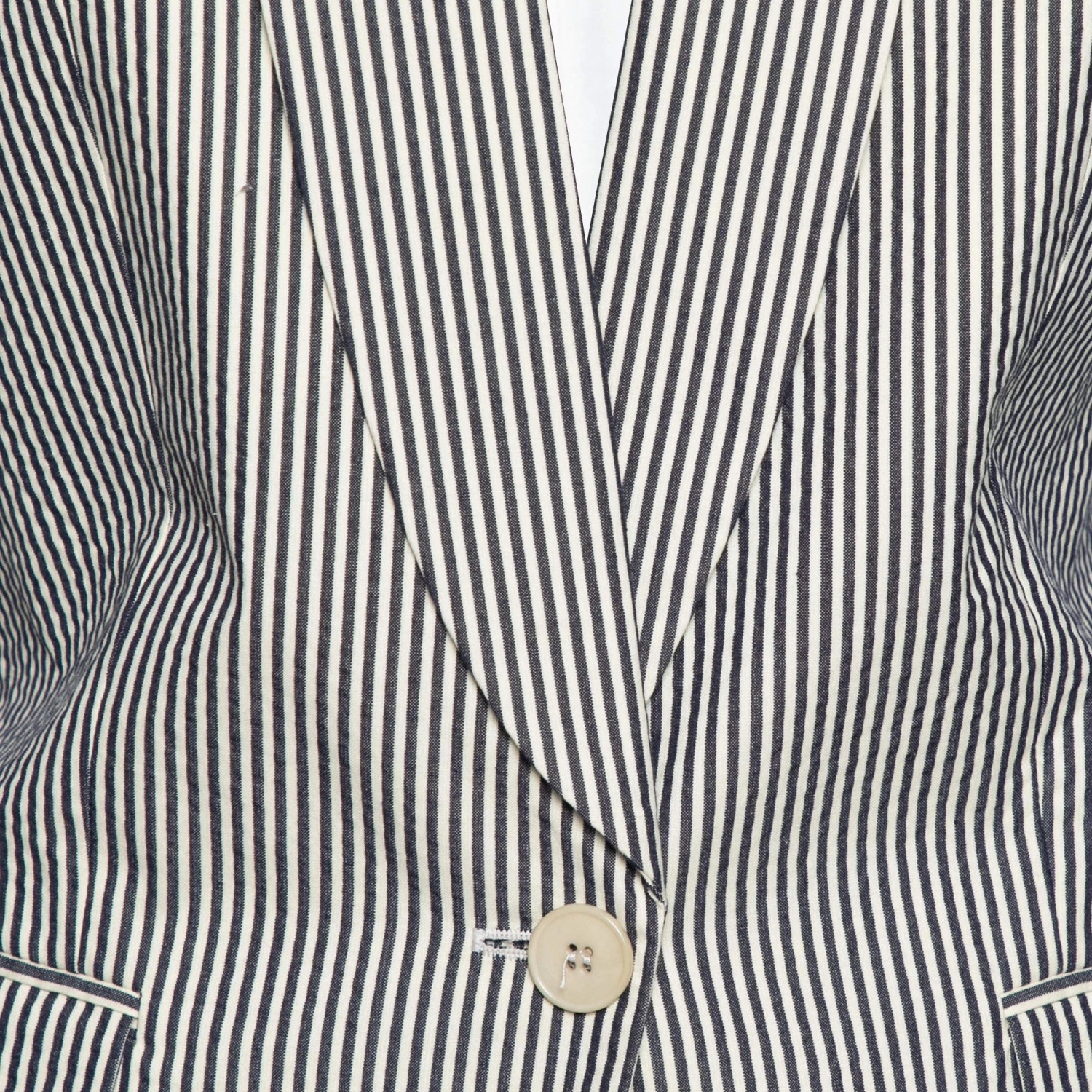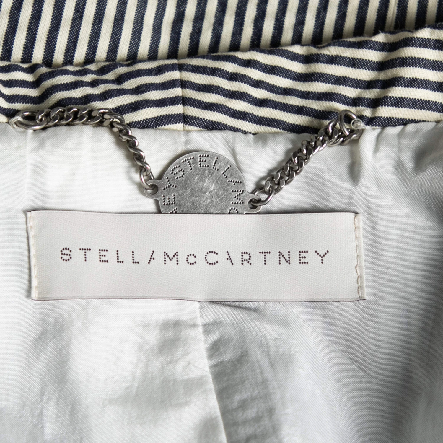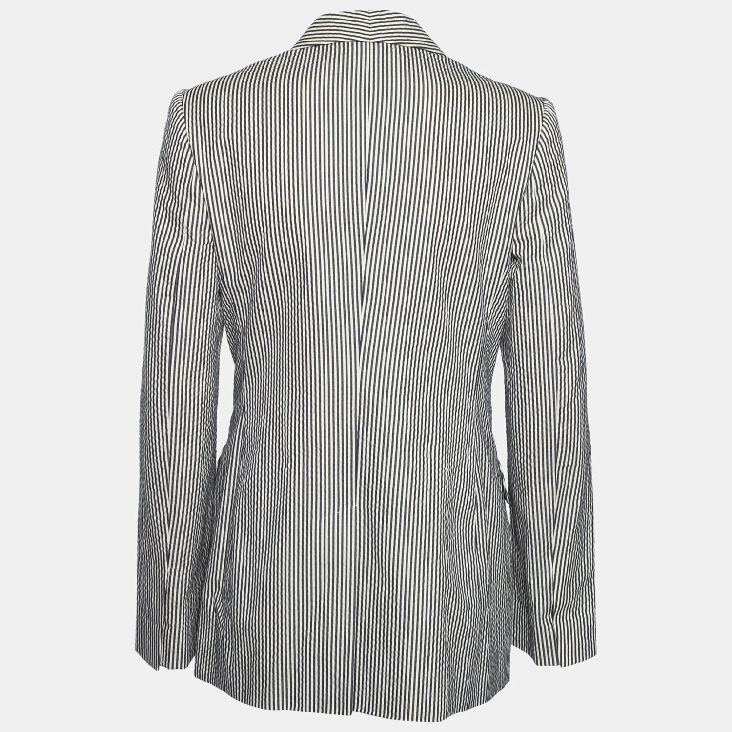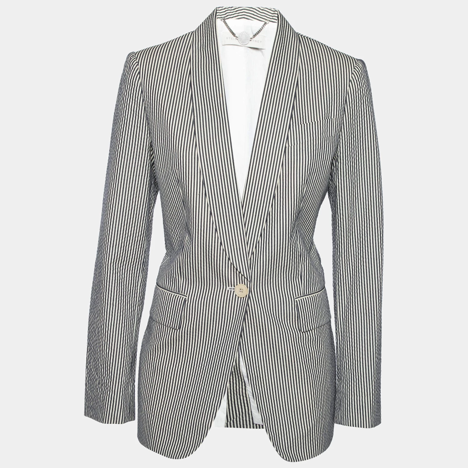 This blazer from the House of Stella McCartney is the best pick to look sophisticated and stylish! It is made from black-white cotton fabric, which is highlighted with striped prints. This blazer has long sleeves and a buttoned closure.