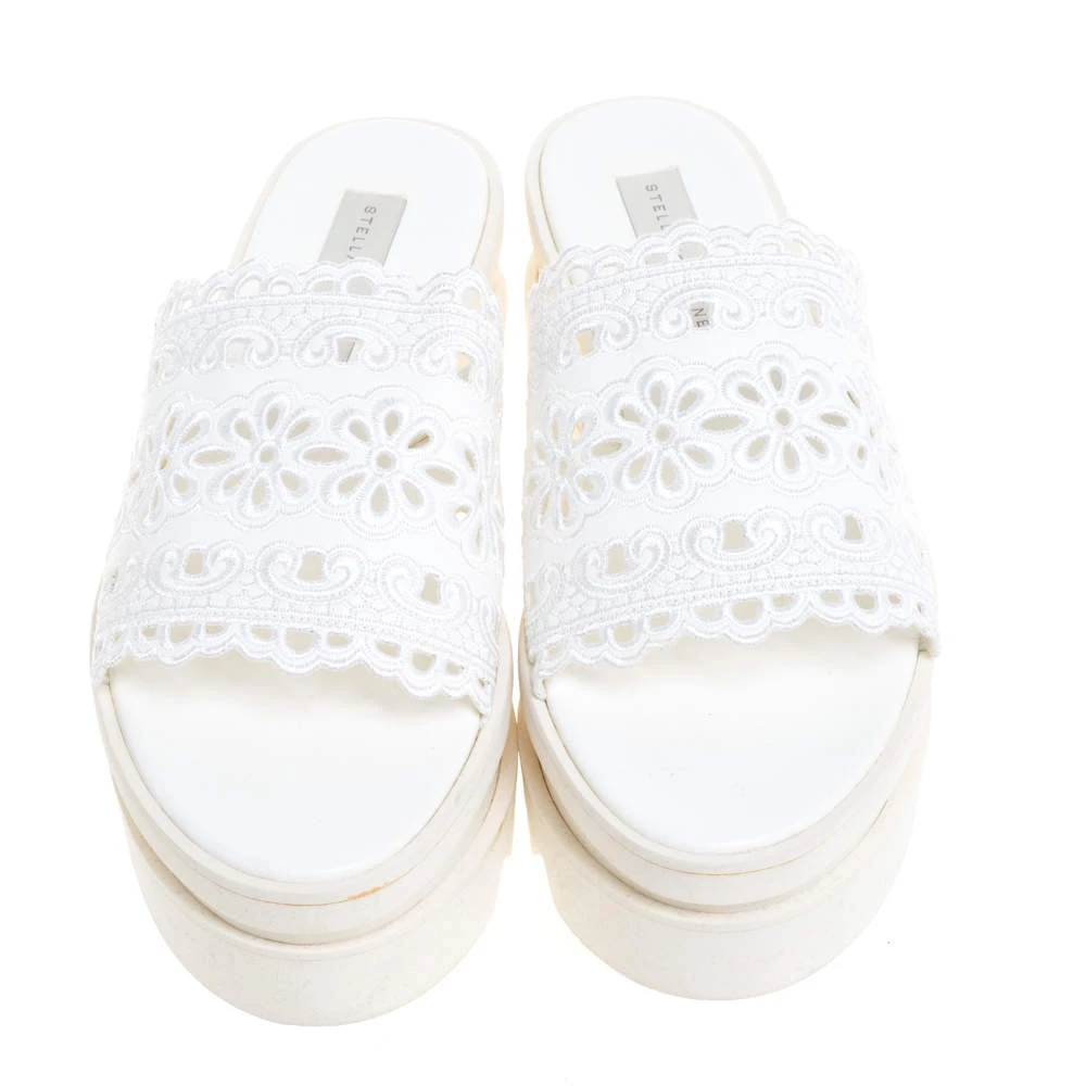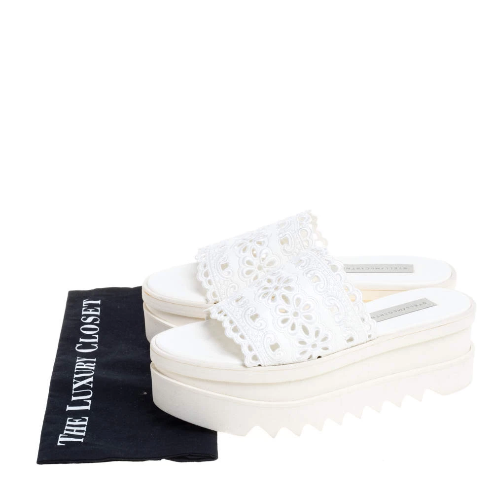 Comfort and fashion join hands to bring to you these fabulous slides from Stella McCartney! The white slides are crafted from faux leather and feature an open toe silhouette. They flaunt lace-cut brocade detailing on the vamps and are raised on 6.5 cm solid platforms that offer maximum grip. Grab them right away and add sparks of luxury to your wardrobe!