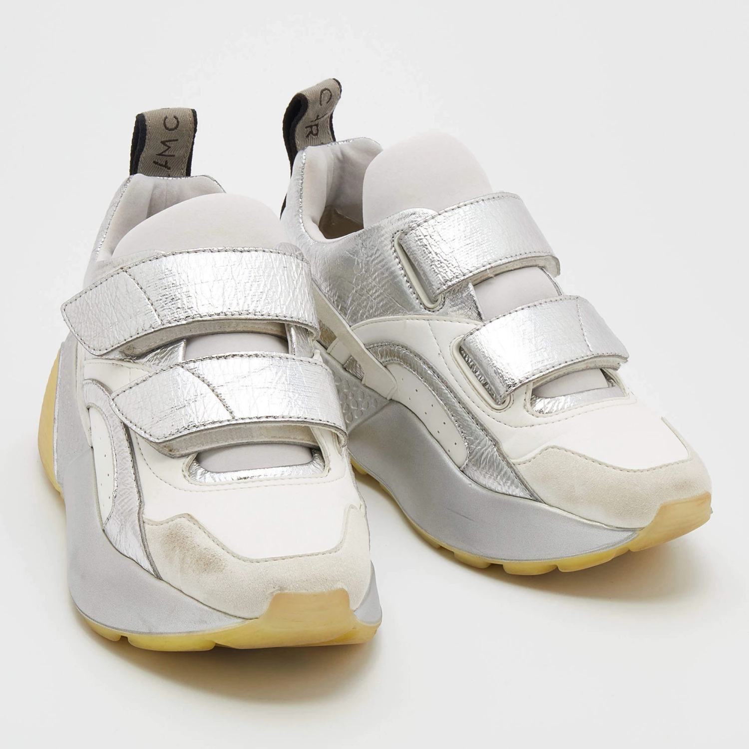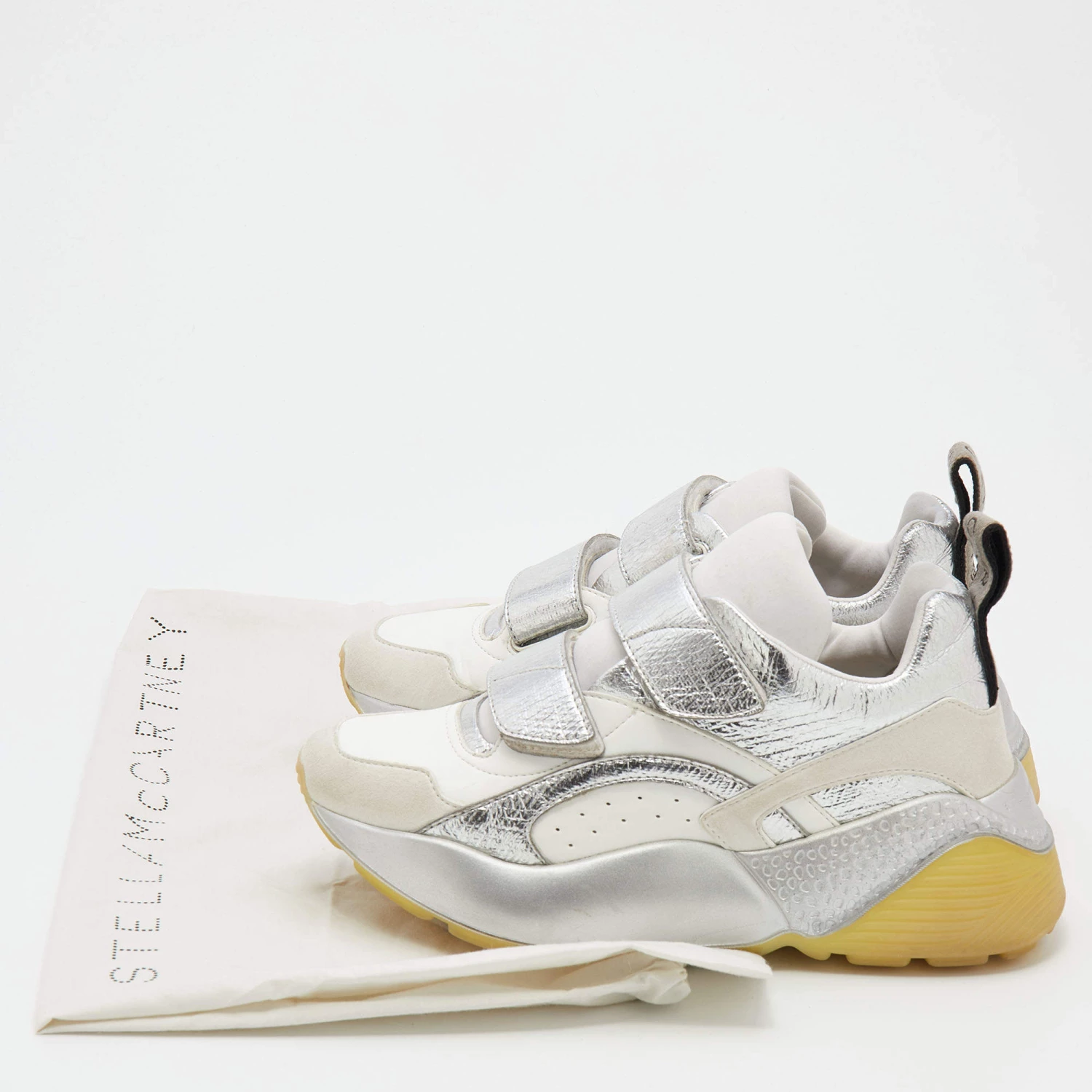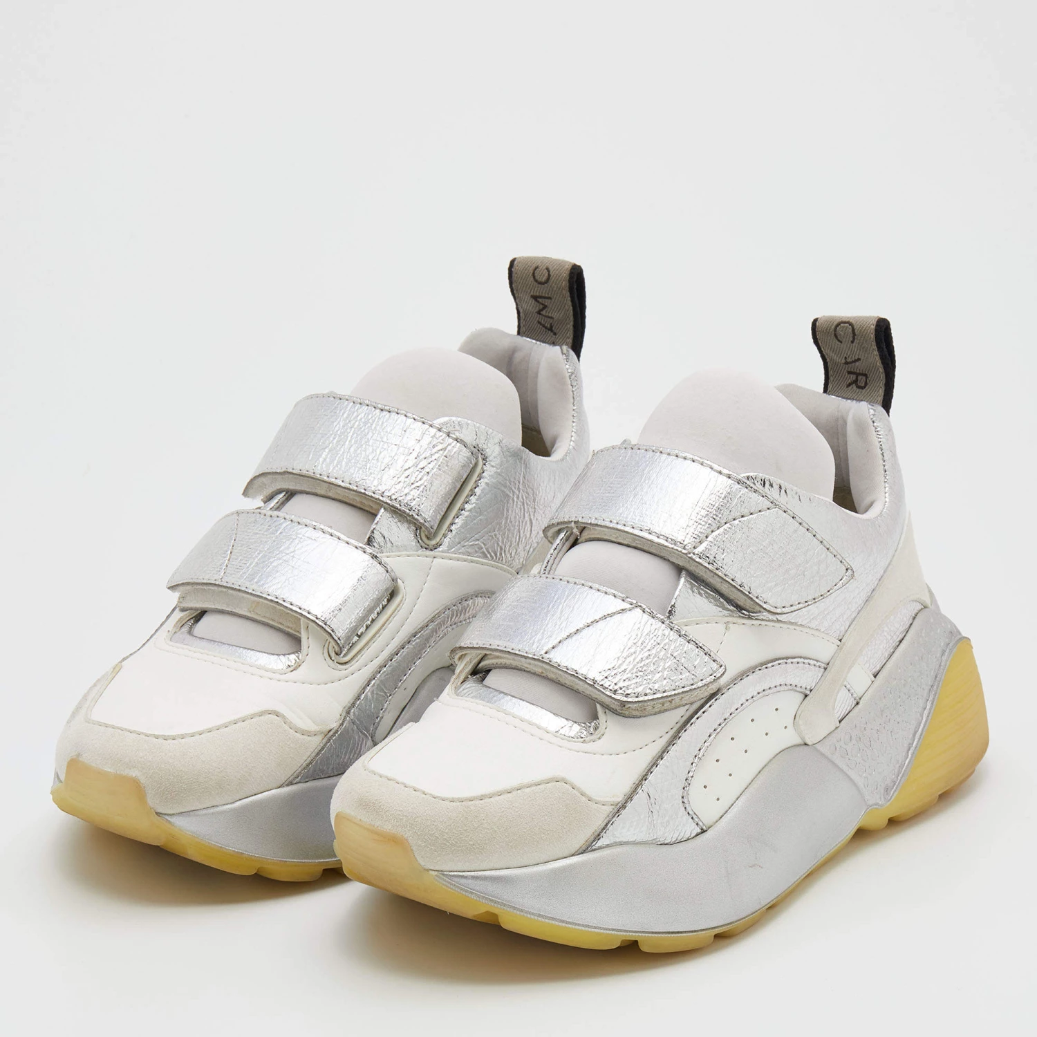Stay in comfort with these sneakers from Stella McCartney. Crafted with a combination of faux leather and faux suede, this pair has textured rubber soles in contrasting tones along with velcro straps on the uppers. Smooth insoles complete these chunky Eclypse sneakers.