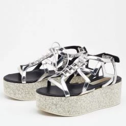 Stella McCartney Metallic Silver Fabric And Faux Leather Espadrille Wedge Sandals Size 36 For Women